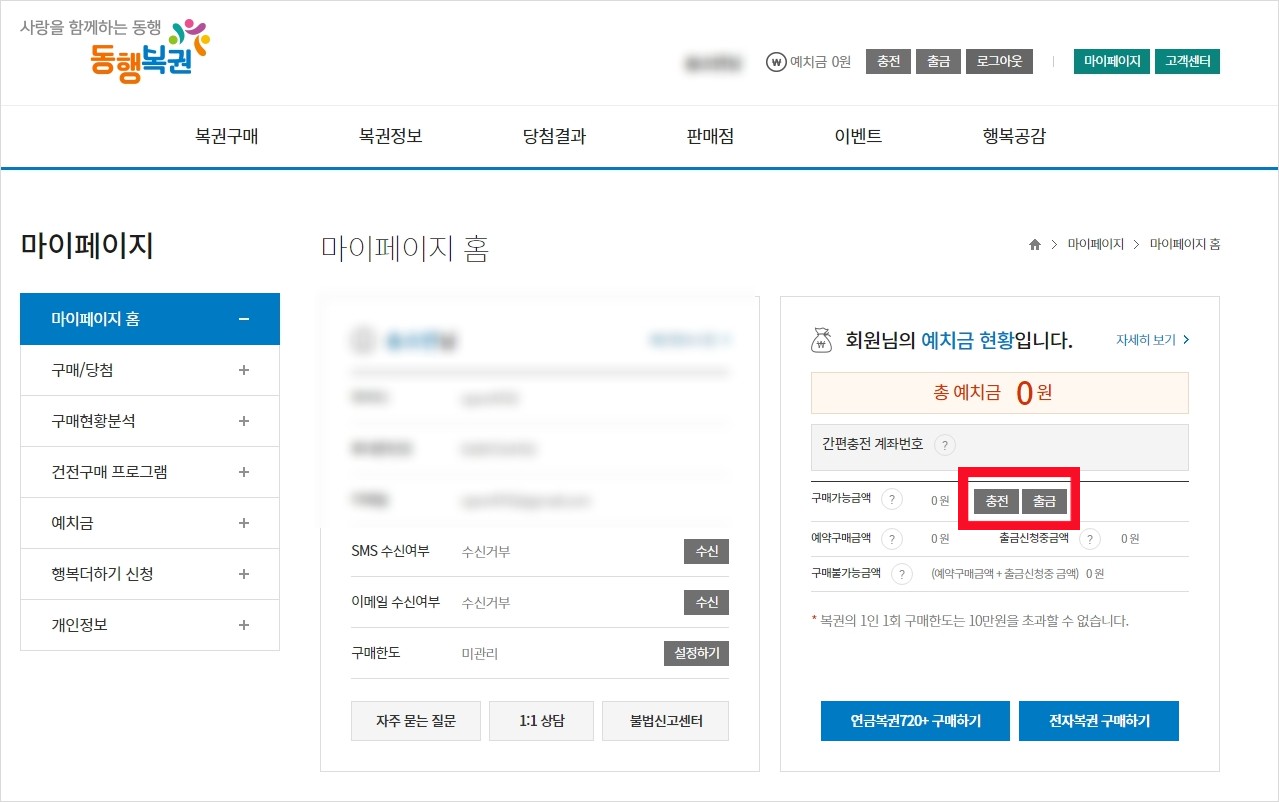 4. 예치금 충전이 끝나셨다면 다시 마이페이지로 돌아와서 예치금 현황 아래 복권 구입하기를 선택해주세요