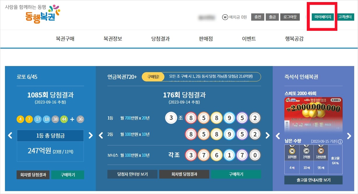 1. 동행복권 홈페이지에 접속하셔서 상단에 마이페이지를 선택해주세요